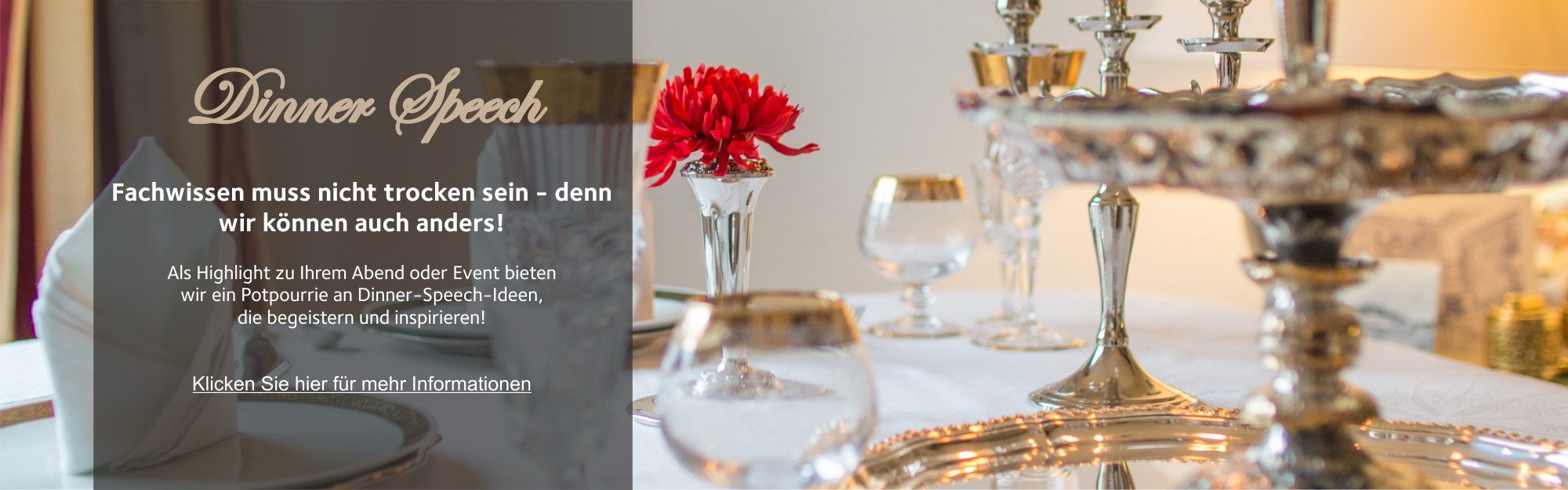 → clickFachwissen muss nicht trocken sein - wir können auch anders! Als Highlight zu Ihrem Abend oder Event bieten wir ein Potpourrie an Dinner-Speech-Ideen!